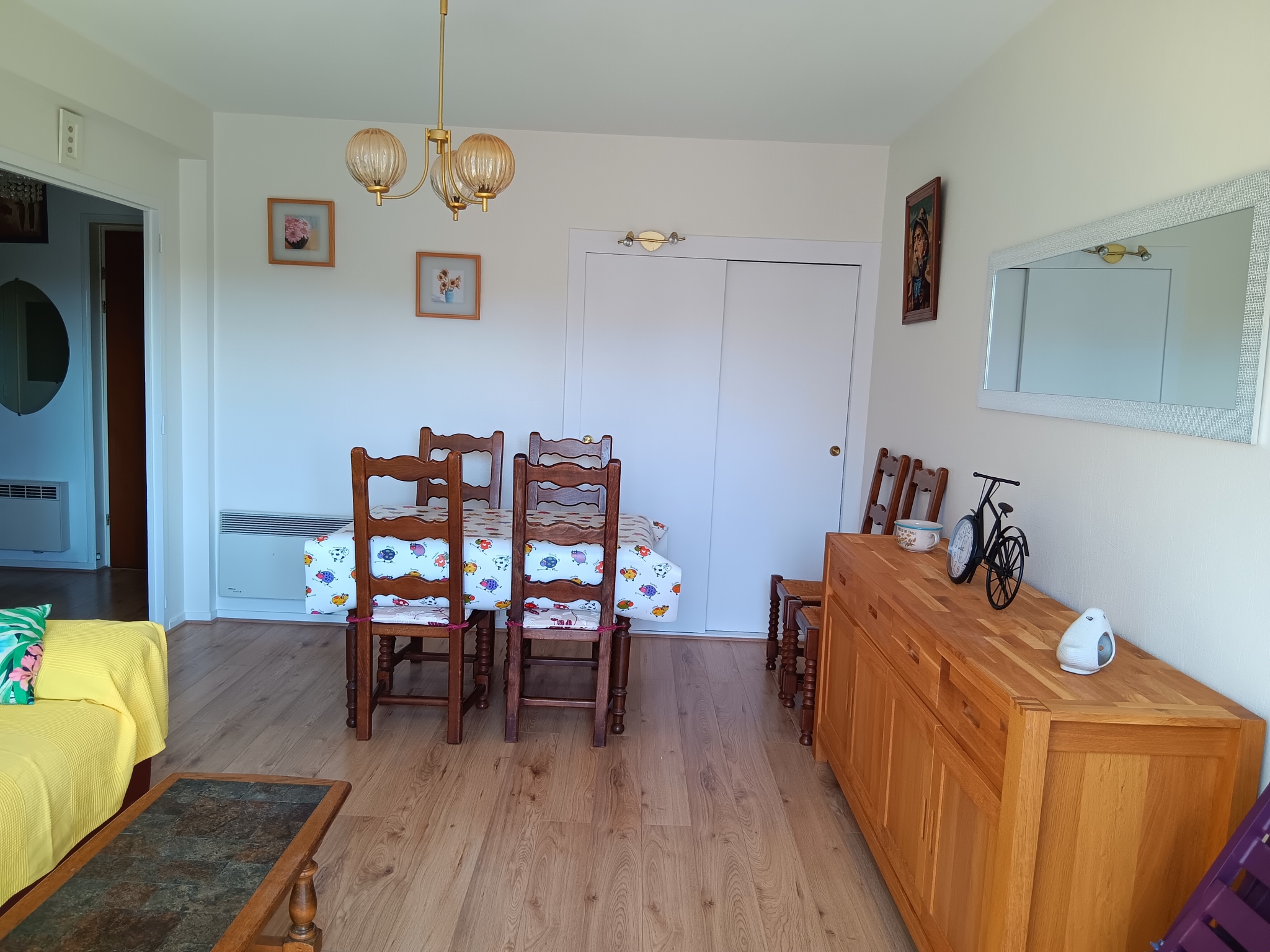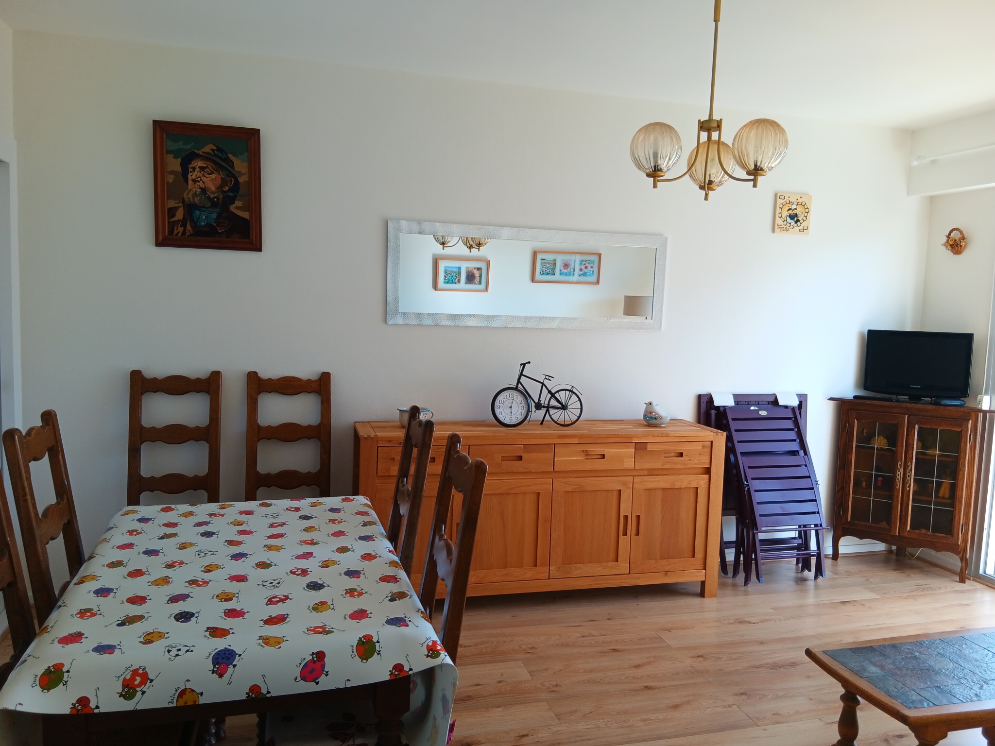 Entrée avec placard – Séjour avec canapé, téléviseur - Balcon avenue Lajarrige – Cuisine indépendante équipée de : lave-vaisselle, lave-linge, 4 plaques électriques, réfrigérateur, congélateur, micro-ondes– 1 petite chambre avec 2 lits superposés d’1 pers – 1 chambre avec 1 lit de 2 pers, balcon av H. Berlioz – Salle d'eau – WC indépendants – 1 place de parking en sous-sol fermé (1er à droite en entrant)