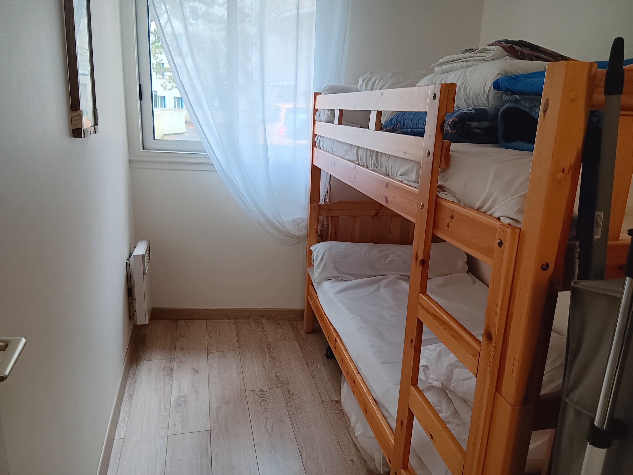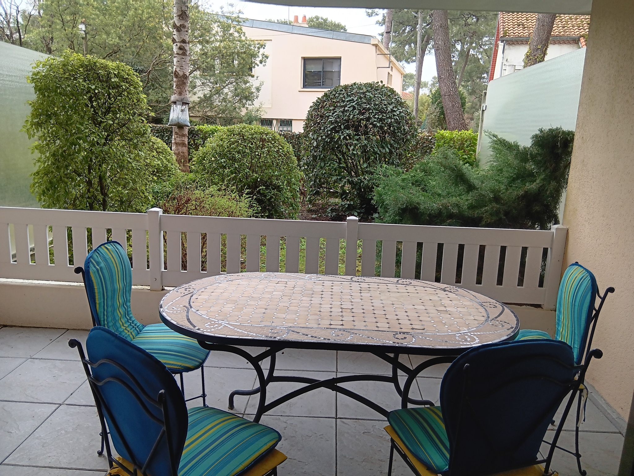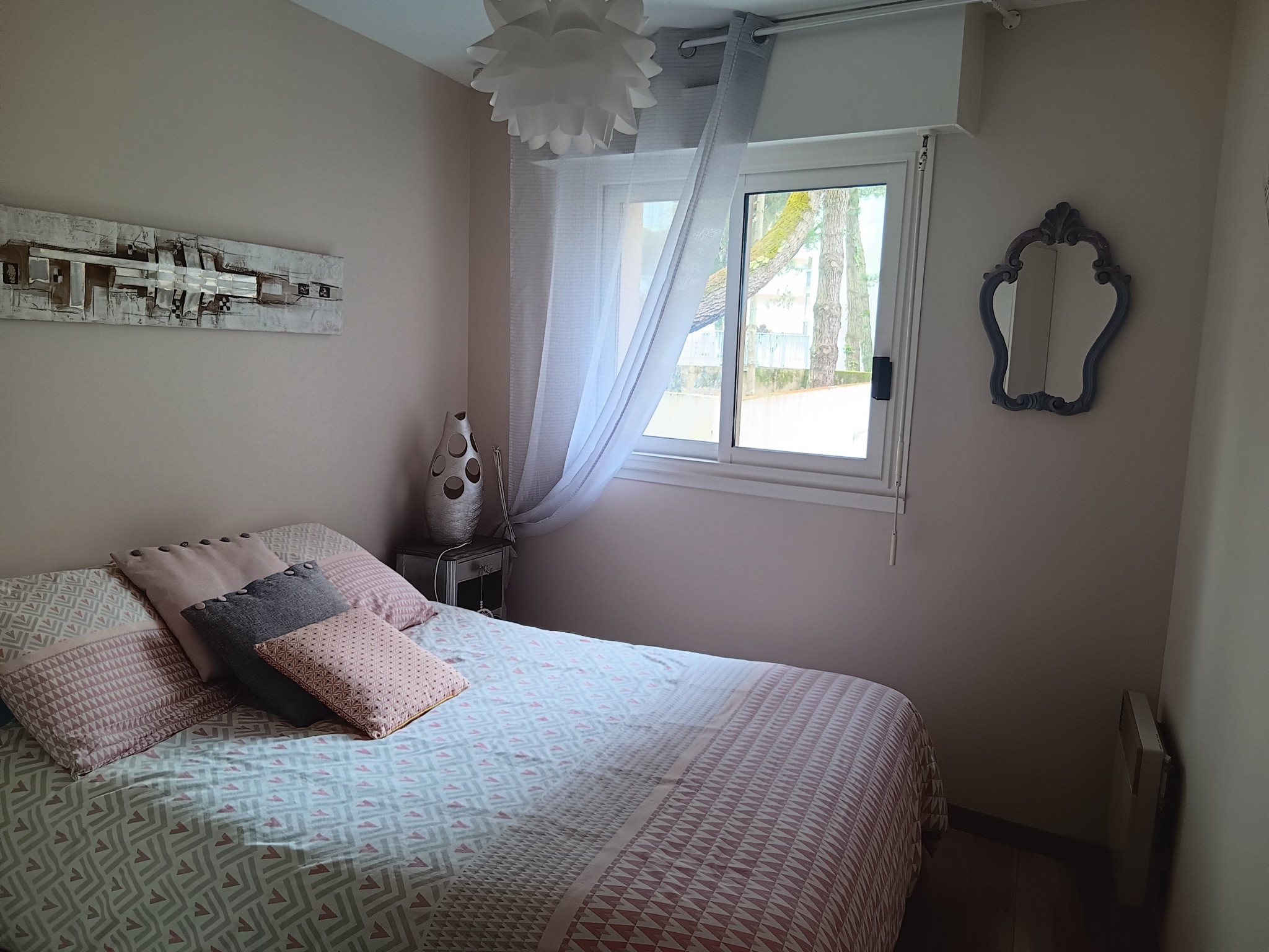 Petit T3 d'environ 40 m², idéalement situé, au calme et près des commerces de l'av Lajarrige, à 600 m env de la plage. Il se compose de : Séjour avec canapé-lit 2 pers, téléviseur - Terrasse abritée expo Ouest avec salon de jardin - Coin-cuisine avec réfrigérateur/conservateur, lave-linge, lave-vaisselle, four, micro-ondes, table de cuisson 3 feux, hotte - 1 petite chambre avec 2 lits superposés - 1 chambre avec 1 lit 2 pers et armoire - Salle de bains avec baignoire, lavabo, WC - Grand garage ss/sol fermé