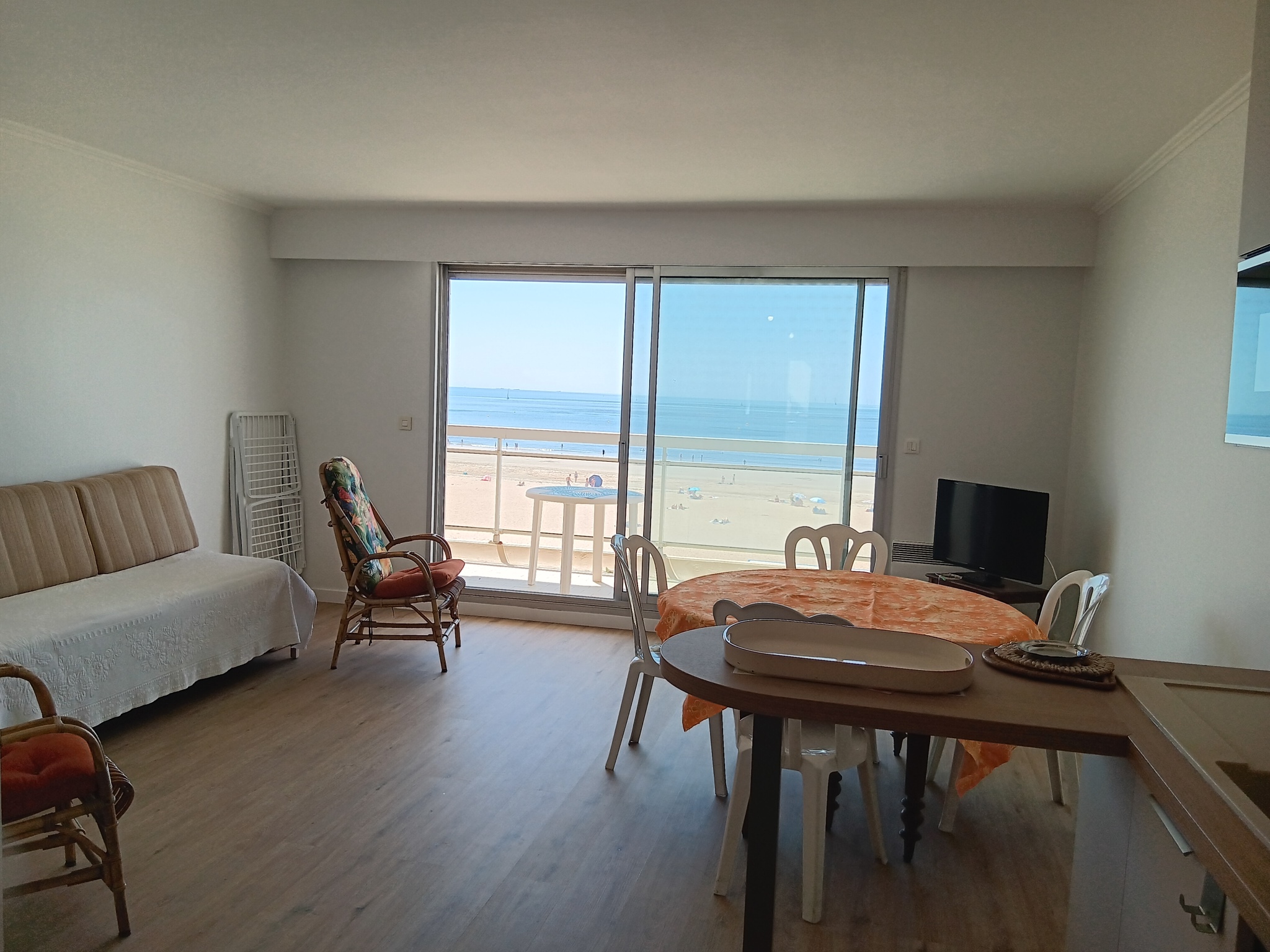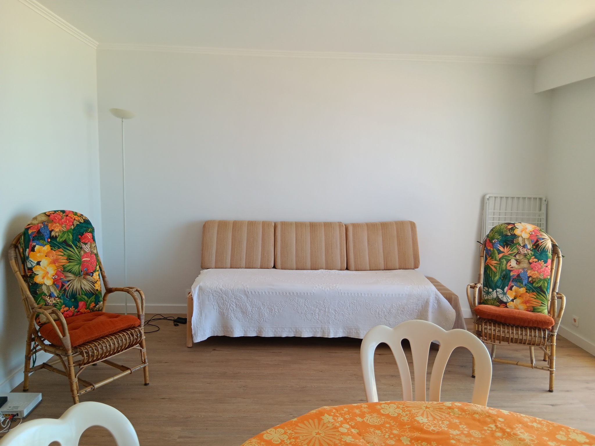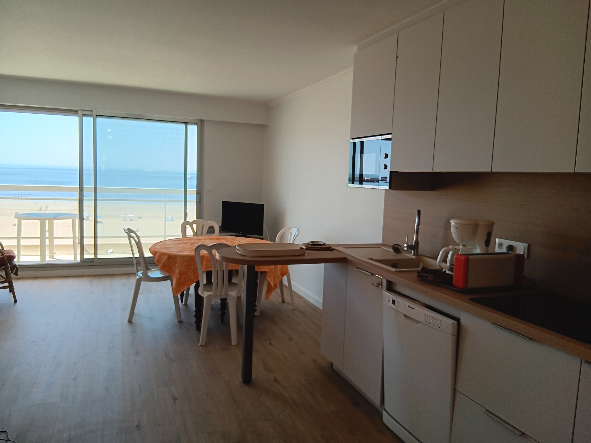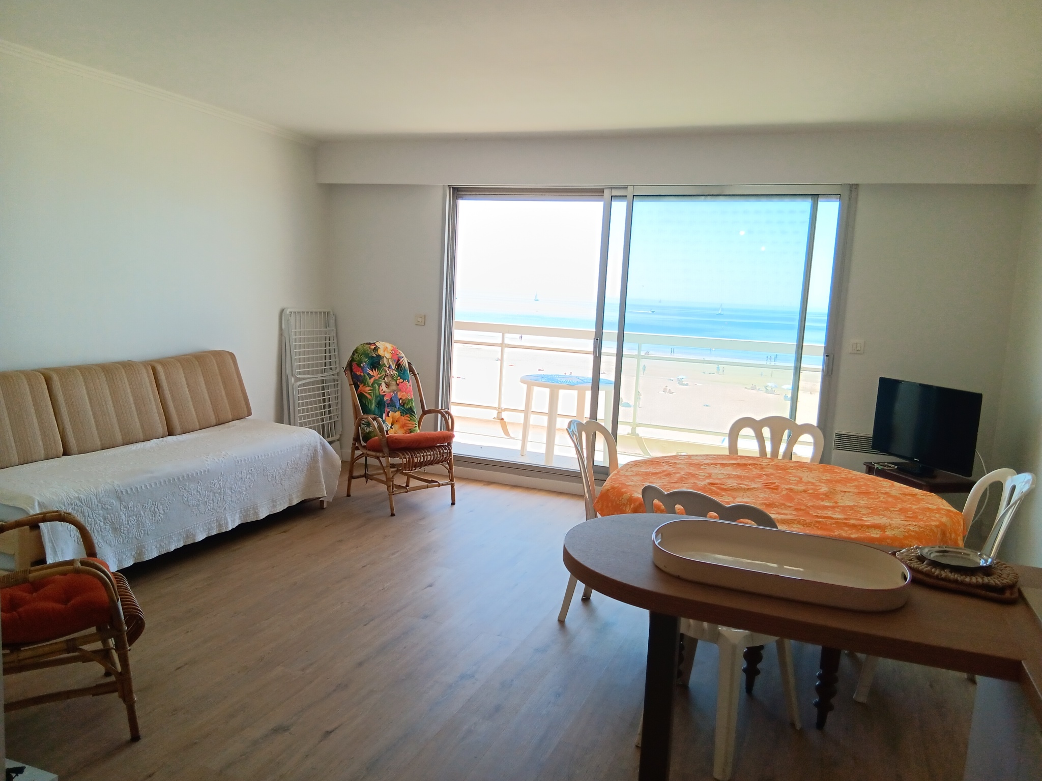 Appartement T2 situé au 2ème étage d’une résidence face mer avec ascenseur, comprenant : Entrée avec placard-penderie - Cuisine ouverte avec table de cuisson vitro, four, réfrigérateur top 3*, lave-vaisselle, micro-ondes - Séjour avec banquette (2 lits empilés ikea = 2 couchages 80X200 cm), 2 fauteuils en rotin, table avec chaises plastique (id balcon), téléviseur - Balcon face mer avec table ronde - Salle de bains avec baignoire et lavabo - 1 chambre avec 2 lits 1 pers (= 1 couchage 160 cm), 1 commode - WC indépendant avec lave-linge. Accès wi-fi.