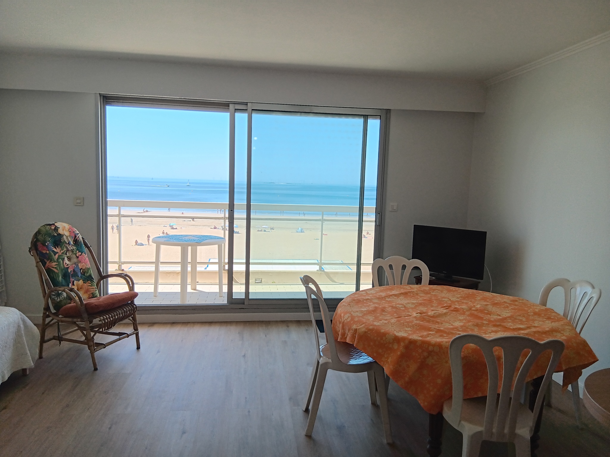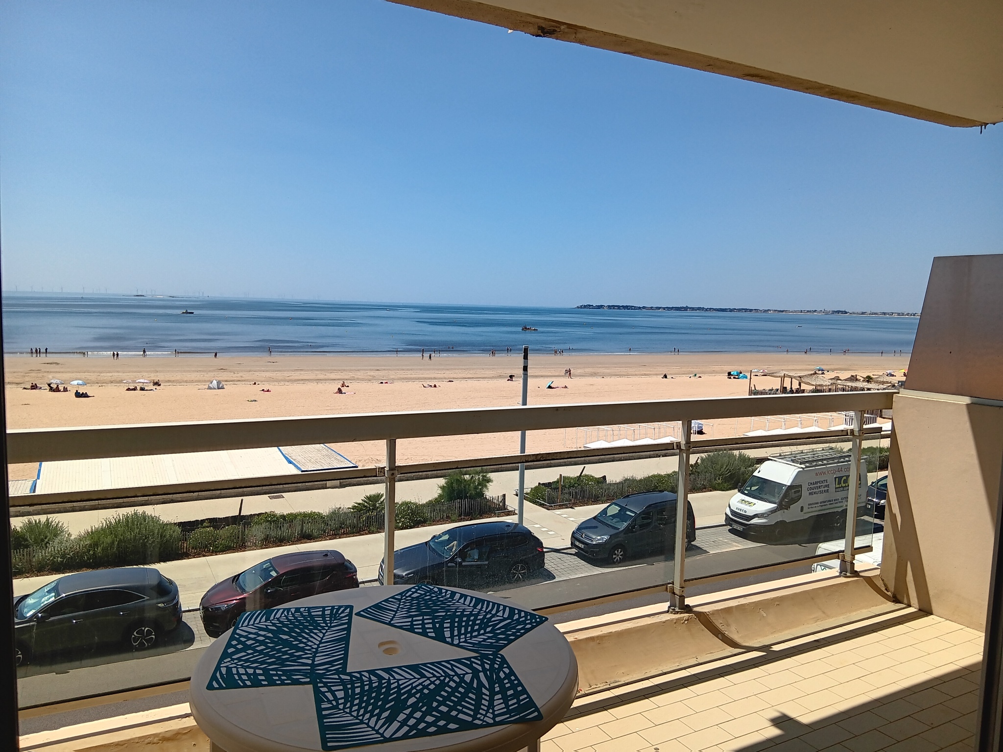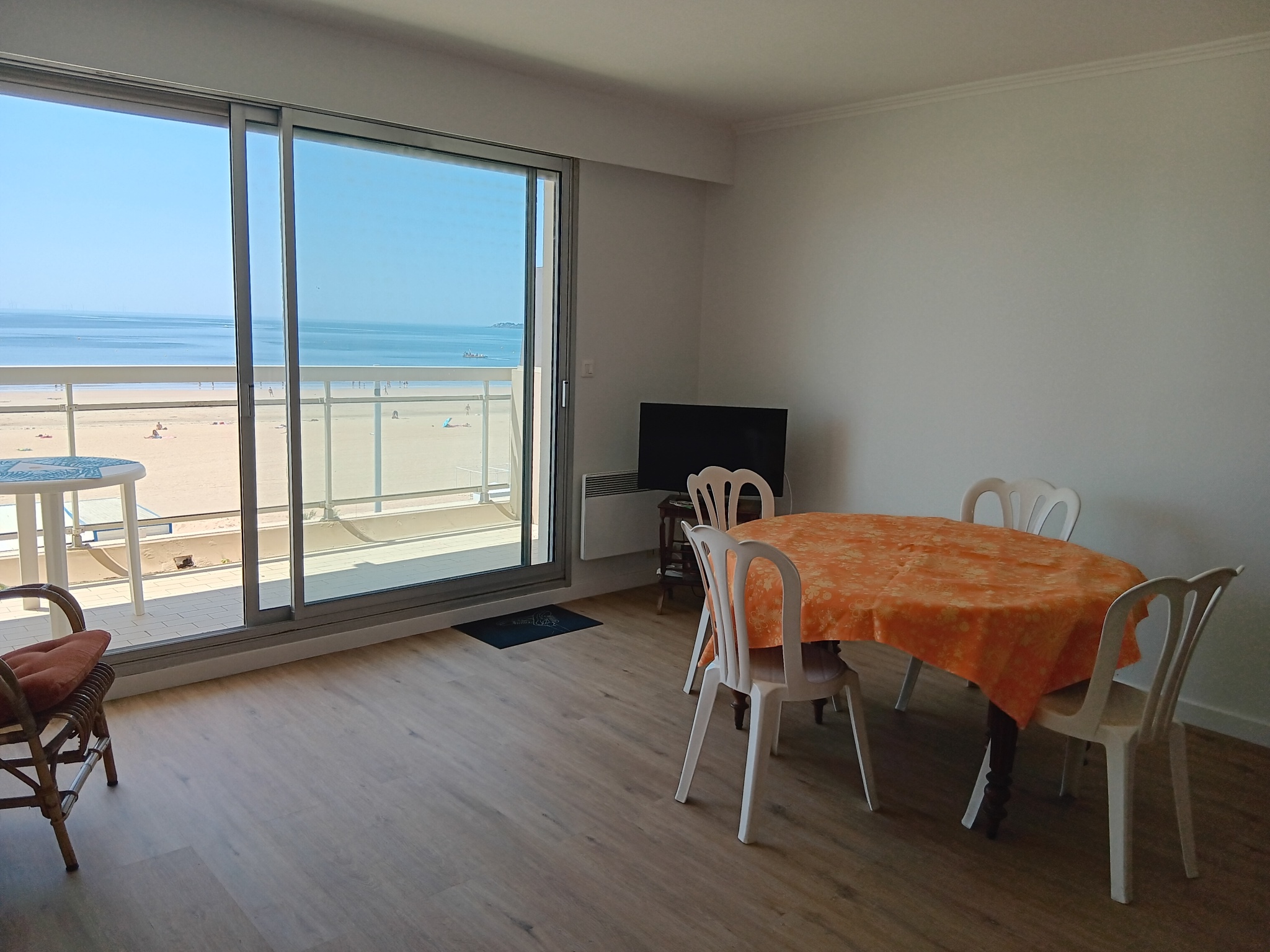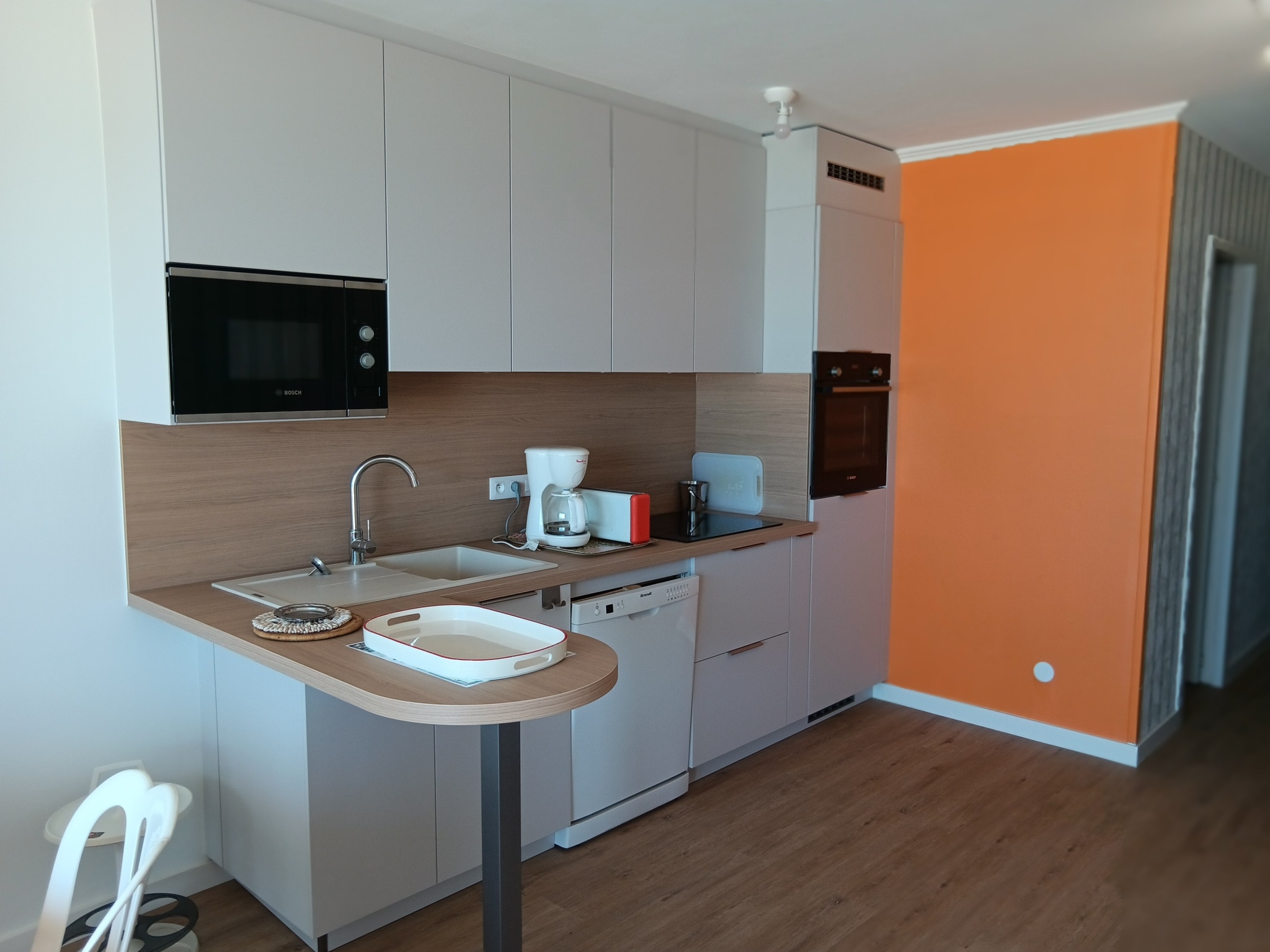 Appartement T2 situé au 2ème étage d’une résidence face mer avec ascenseur, comprenant : Entrée avec placard-penderie - Cuisine ouverte avec table de cuisson vitro, four, réfrigérateur top 3*, lave-vaisselle, micro-ondes - Séjour avec banquette (2 lits empilés ikea = 2 couchages 80X200 cm), 2 fauteuils en rotin, table avec chaises plastique (id balcon), téléviseur - Balcon face mer avec table ronde - Salle de bains avec baignoire et lavabo - 1 chambre avec 2 lits 1 pers (= 1 couchage 160 cm), 1 commode - WC indépendant avec lave-linge. Accès wi-fi.