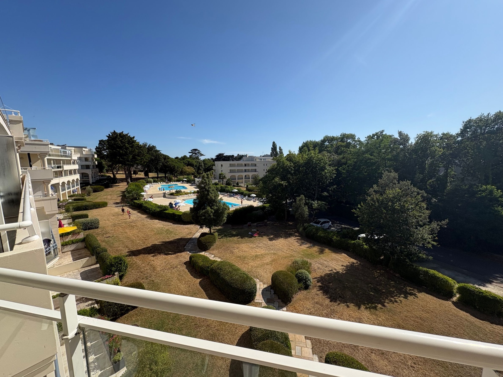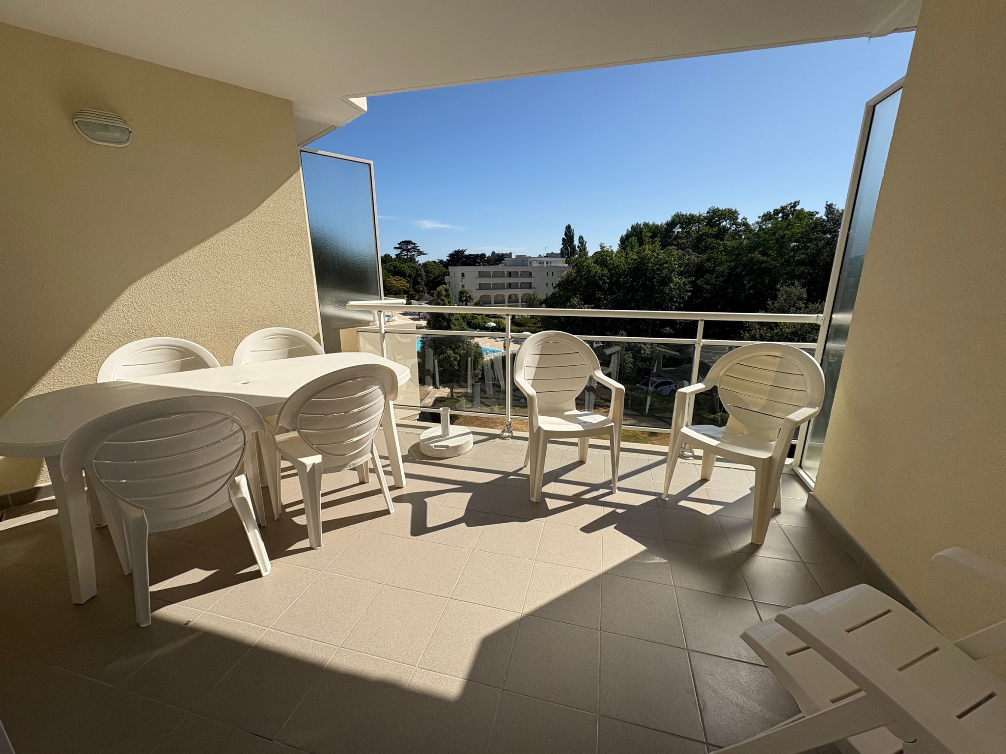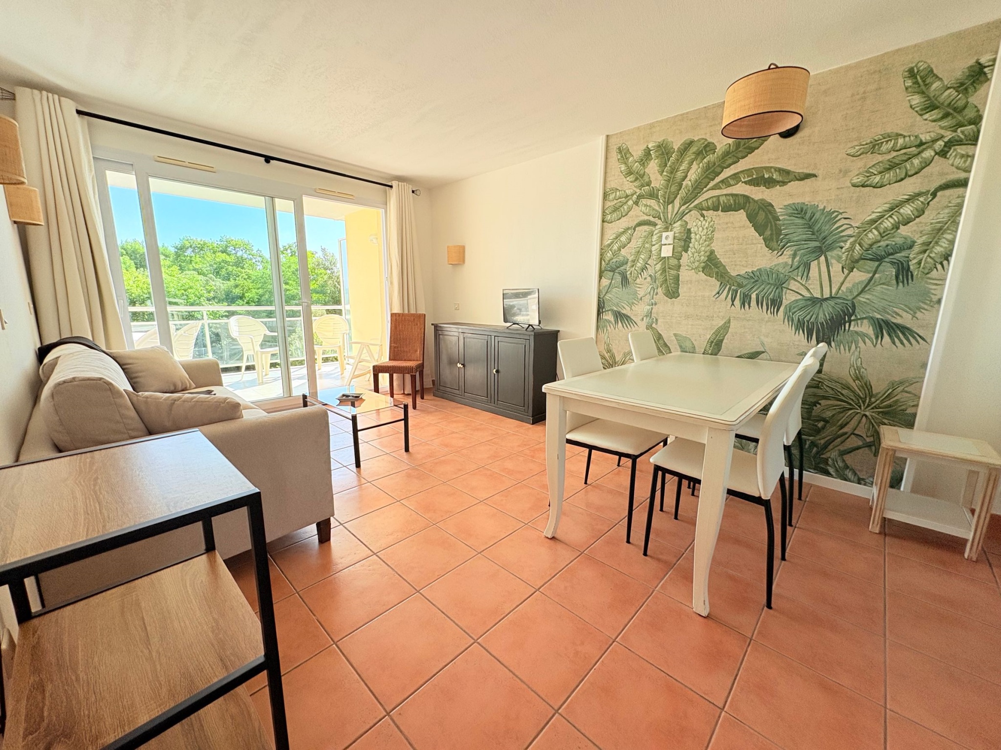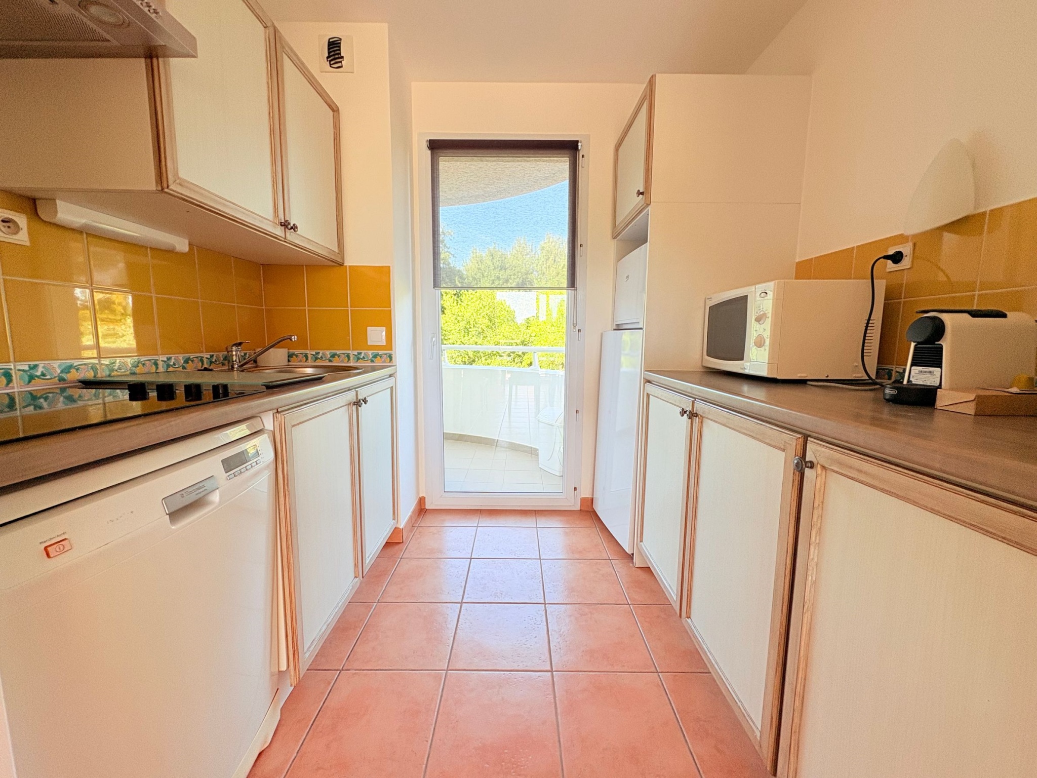 Bât K 'les lauriers', au 3ème étage, appartement composé de : séjour ouvrant sur balcon avec vue sur parc et piscines, coin-cuisine (ouvrant sur petit balcon) aménagé/équipé (plaque cuisson vitrocéramique, lave-vaisselle, réfrigérateur/congélateur, micro-ondes/gill), 1 chambre avec lit 140 cm et penderie, 1 chambre avec 2 lits enfants 80 cm et bacs de rangement sous lits, salle de bains, wc indép, 1 place de stationnement extérieur n°328