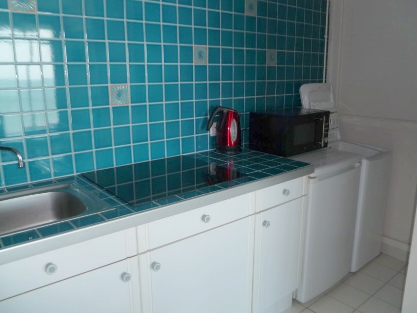 Cet appartement se compose de : Entrée - Séjour donnant sur balcon face mer avec salon de jardin, 2 canapés convertibles (couchages 120 x200 cm) , téléviseur - Coin-cuisine équipé de : table de cuisson induction, four, réfrigérateur, micro-ondes, lave-vaisselle, lave-linge - Petite chambre face mer avec 1 lit 140 cm, placard et coffre de rangement - Salle d'eau avec cabine douche - WC